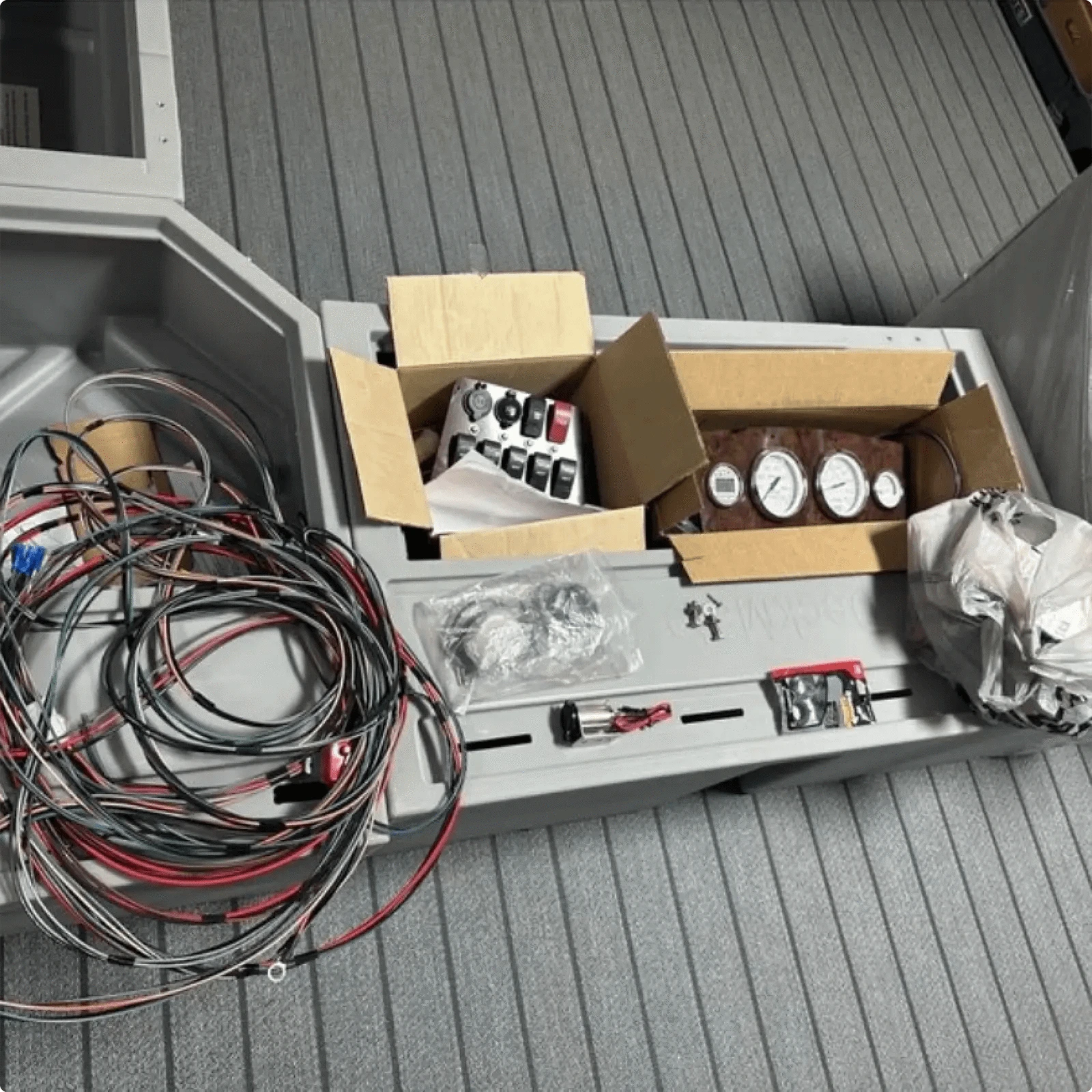 The couple also made major updates to the bells and whistles of his boat, including gauges and switches. He also added a new console, lighting, a Bimini, and a steering system enhancement.